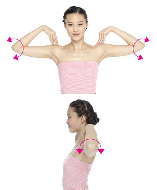 ②双手侧平举后,两手弯曲指指尖触摸锁骨外侧,逆时针转两个八拍