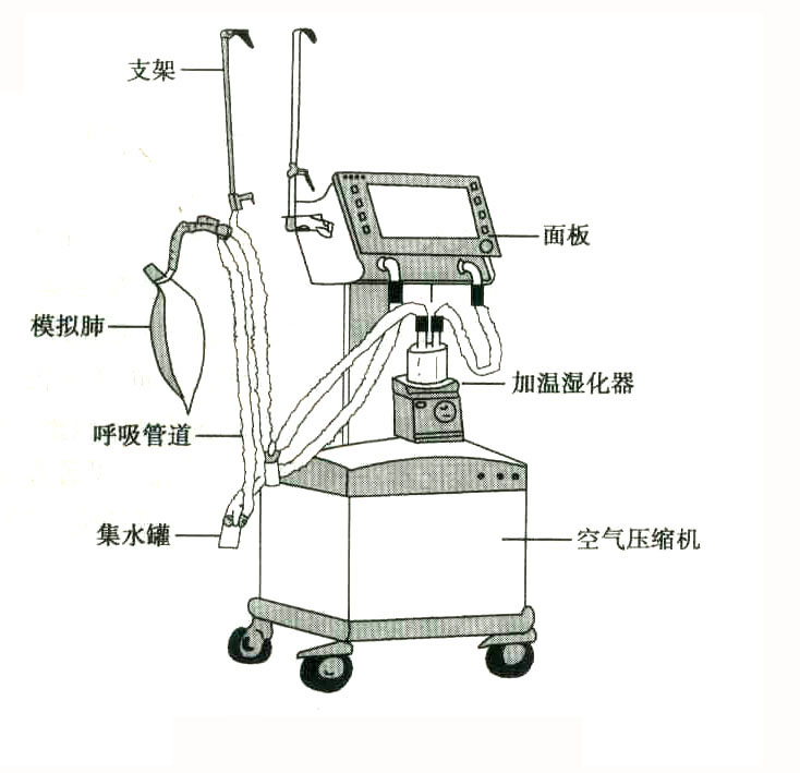 3.辅助装置:通常有湿化器、空气混合器、雾化装置、支架、管路、集水罐、安全阀等。