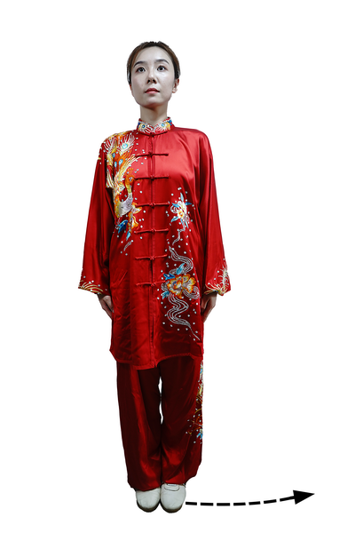 重心移至右腿;左脚向左侧开步,脚尖朝前,约与肩同宽。