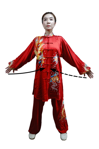 两臂内旋,两掌分别向两侧摆起,约与髋同高,掌心向后