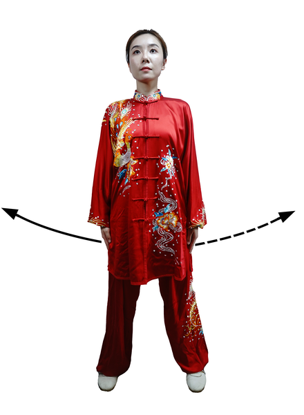 上动不停。两膝关节微屈;同时,两臂外旋,向前合抱于腹前呈圆弧形,与脐同高,掌心向内,两掌指间距约10厘米;目视前方。