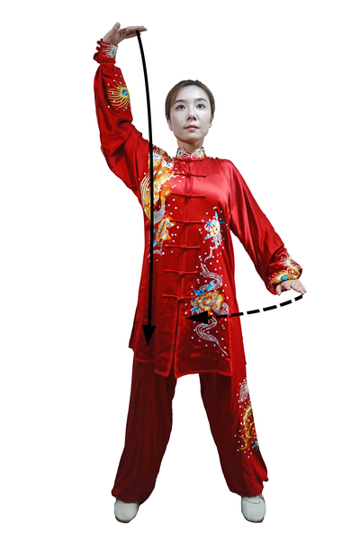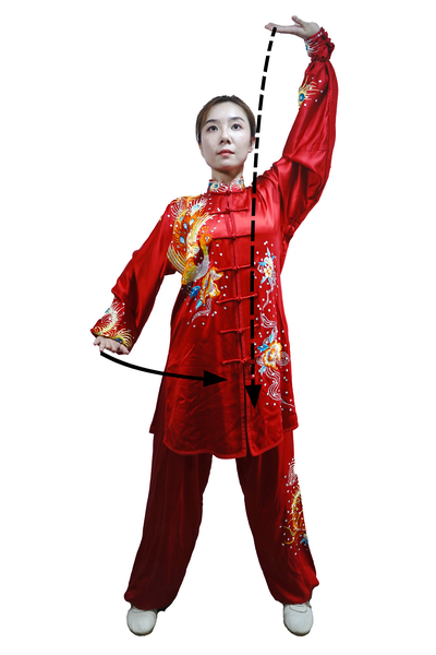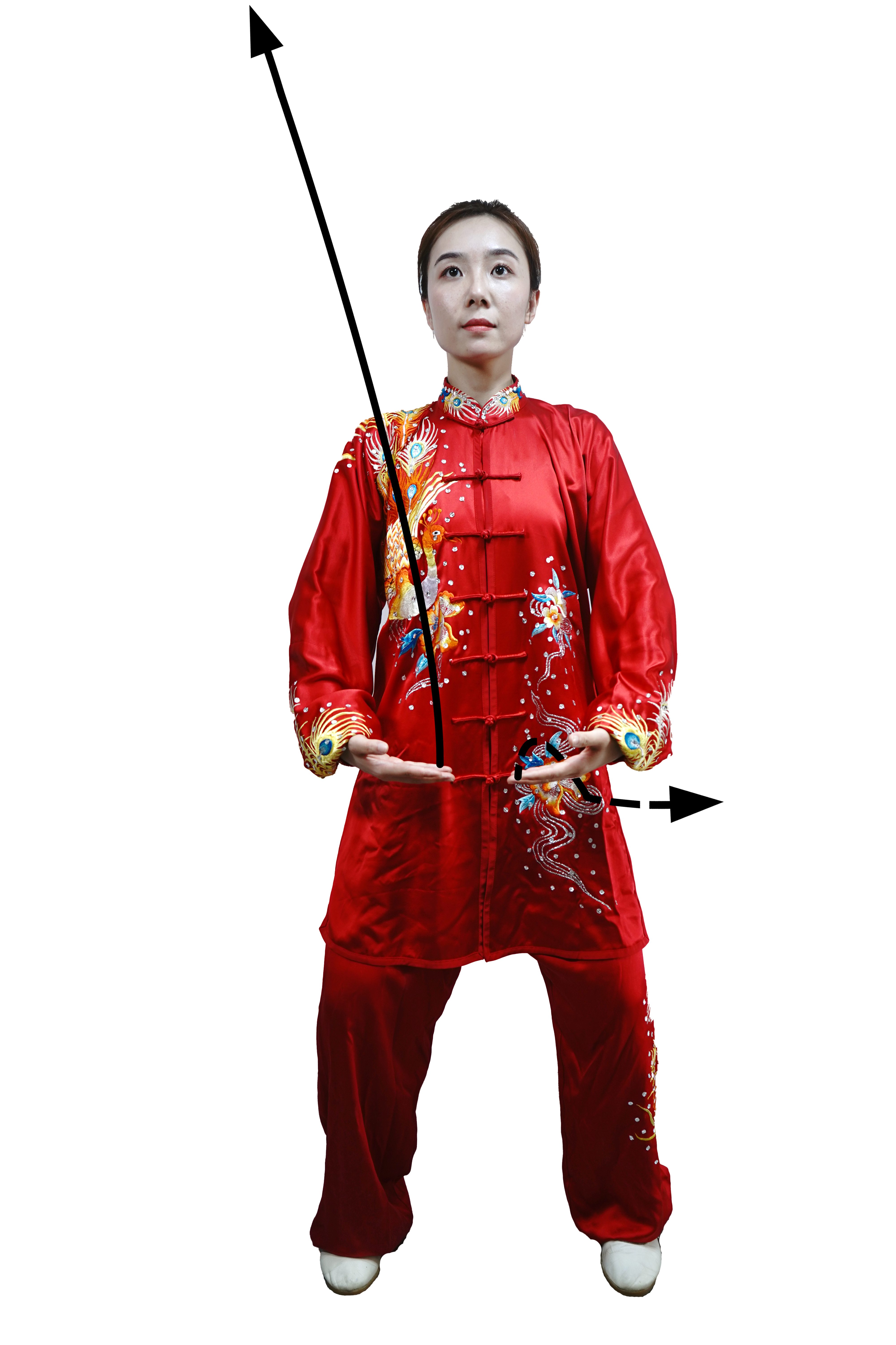 动作一:接上式。两腿徐缓挺膝伸直;同时,左掌上托,左臂外旋上穿经面前,随之臂内旋上举至头左上方,肘关节微屈,力达掌根,掌心向上,掌指向右,同时,右掌上托,随着臂内旋下按至右髋旁,肘关节微屈,力达掌根,掌心向下,掌指向前,动作稍停,目视前方。(图23)