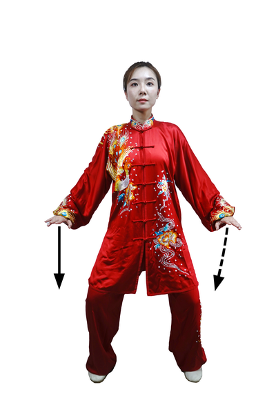 第三遍最后一动时,两腿膝关节微屈;同时,右臂屈肘,右掌下按于右髋旁,掌心向下,掌指向前;目视前方(图27 )。
