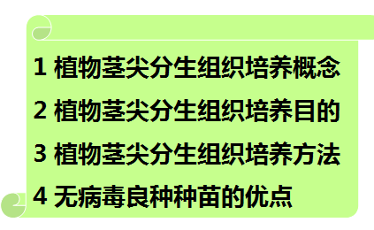 在本章里,将重点介绍植物茎尖分生组织培养的概念、植物茎尖分生组织培养目的、植物茎尖分生组织培养方法以及无毒良种种苗的有点。