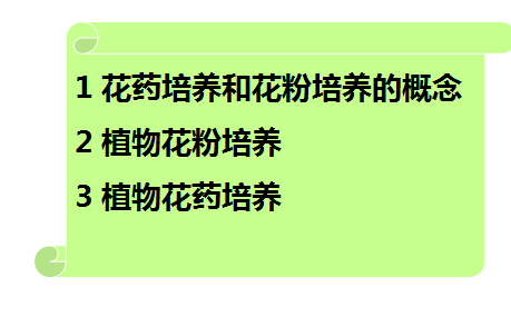 本章介绍了花药和花粉培养的概念、优点,对花药和花粉培养的方法和影响因素进行了详细介绍。