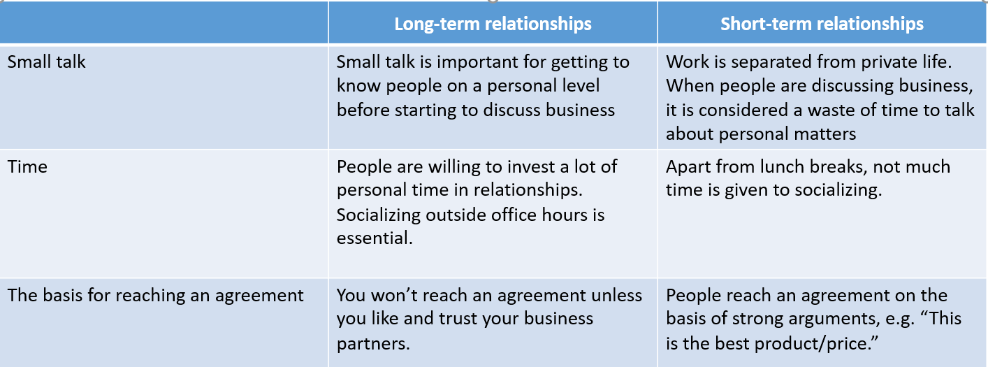 Somecultures prefer to build long-term business relationships and invest a lot ofpersonal time socializing out of office hours to create trust andunderstanding. Other cultures prefer short-term relationships based on specificdeals and contracts with little personal contact.