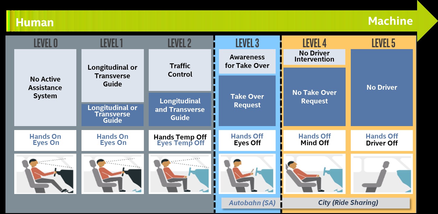 In Europa (u. a. Bundesanstalt für Straßenwesen und den USA (z. B. SAE J3016) wird die Klassifizierung des autonomen Fahrens in sechs Stufen vorgenommen: