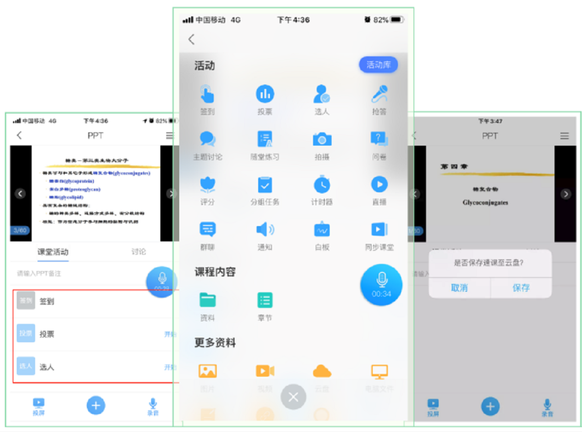 突破师生空间距离限制,在非面对面的情况,可以看到教师正在授课的PPT,并同时听到教师的授课声音,满足师生远程课堂教学所面对的困扰。在教室内,教师可以将教学课件投屏到教室的投影仪上,教室内的同学可以直接在课堂进行课程学习并与教师进行课堂互动;不在教室的同学同样可以通过同步课堂功能看到教师PPT动画,同步教师的授课声音,身临其境,并同时参与课堂互动