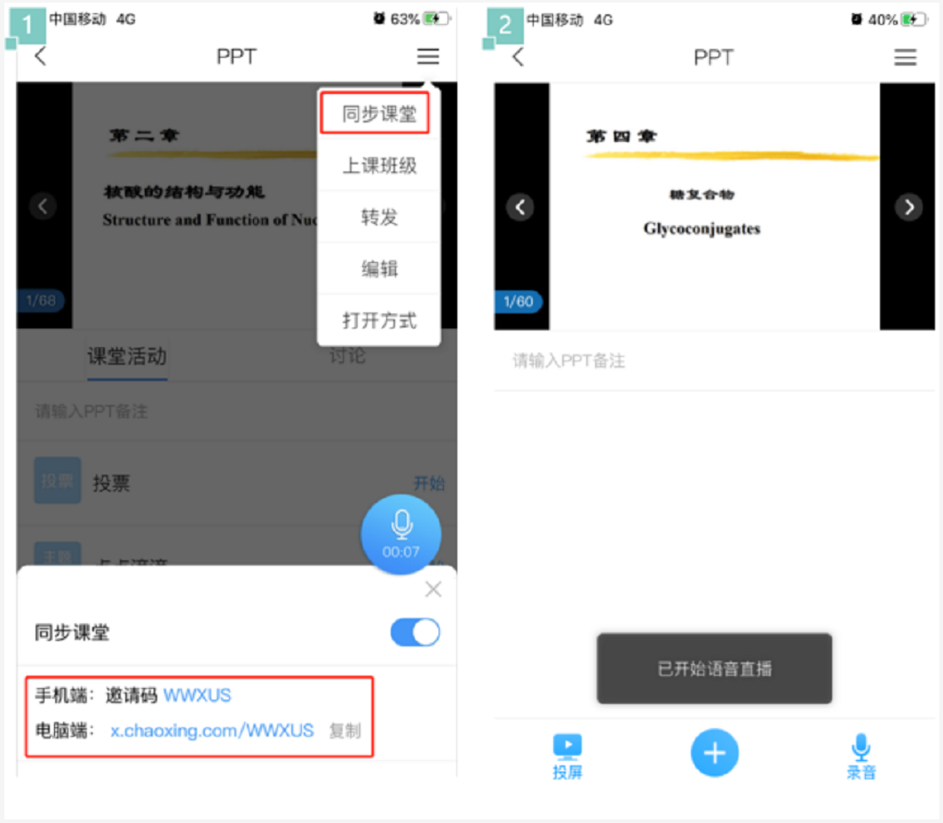 点击右上角菜单选择,选择同步课堂,可以分享该课堂,学生可在手机输入邀请码加入或在PC端打开链接加入该同步课堂。