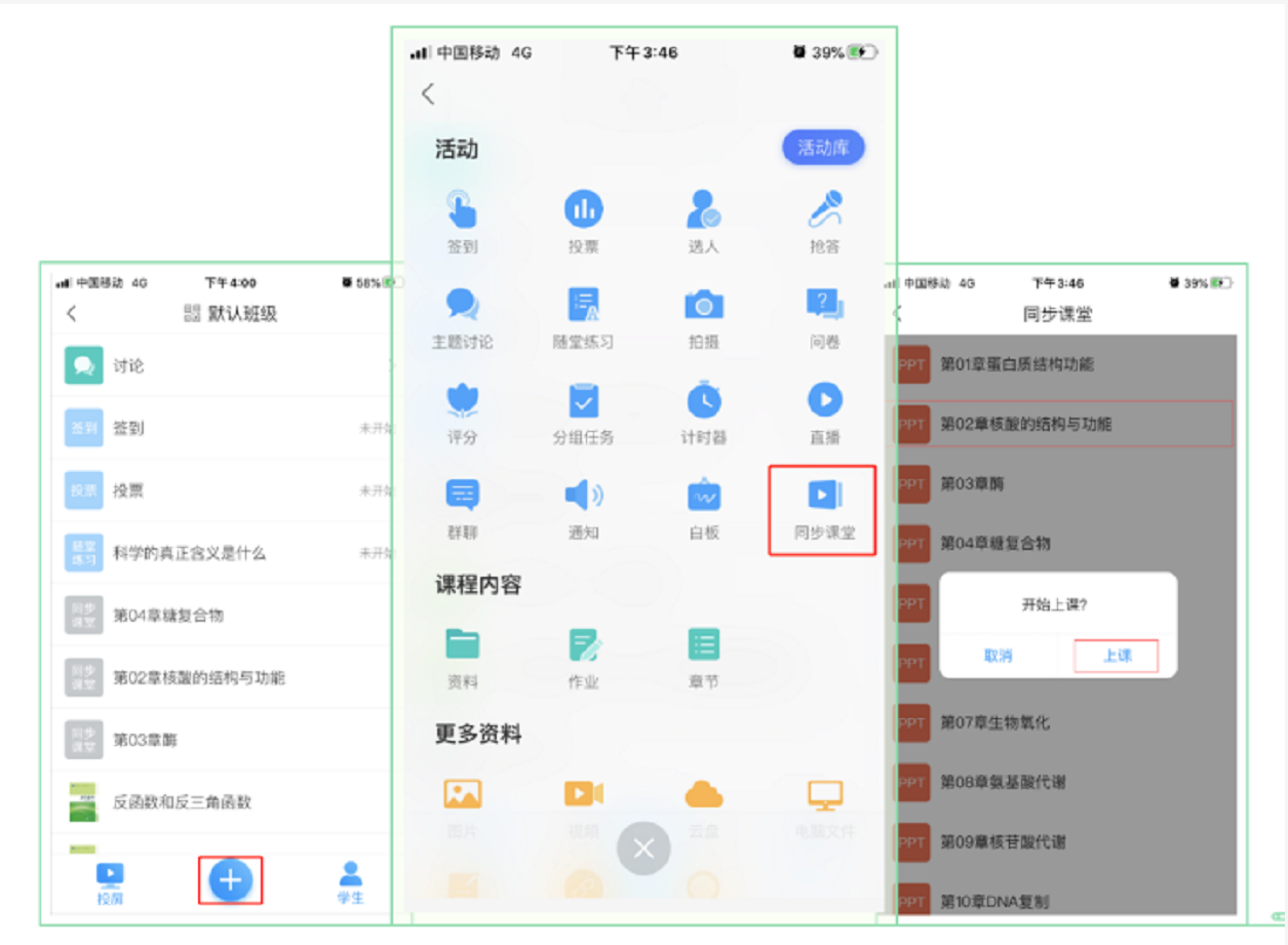 教师选择一门课程,一个班级开始上课,点击手机下排加号按钮,找到同步课堂,选择备课的PPT开始上课。