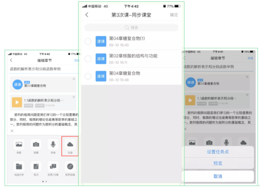 课程章节的编辑中,可以插入同步课堂形成的速课,并将其设置为任务点