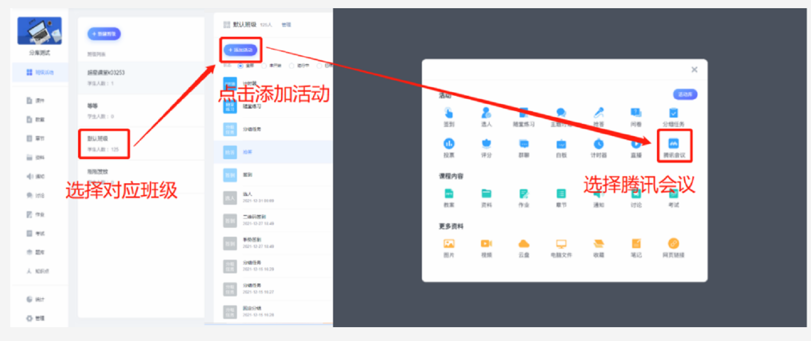 进入要上课的班级,点击“添加活动”,选择腾讯会议。