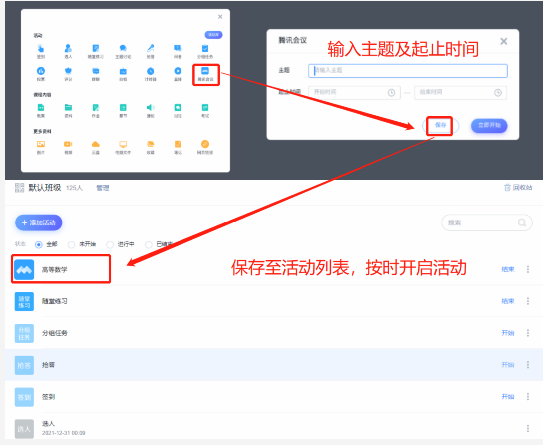 2.按照课表输入标题及时间后确定,点击保存至活动列表;