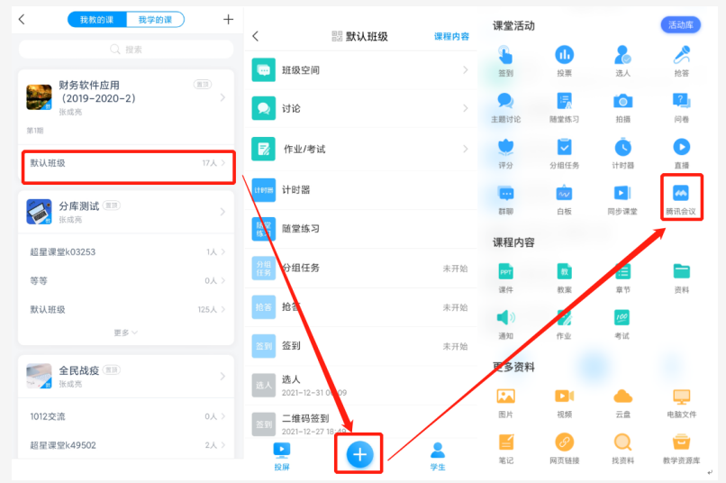 1.进入要上课的班级,点击“添加活动”,选择腾讯会议;(如看不到请点击课程界面右上角进入体验新版)