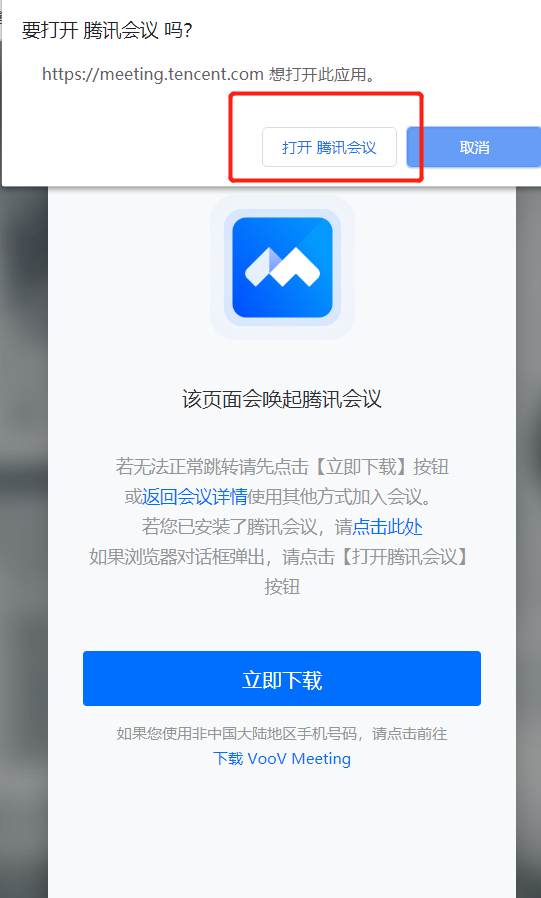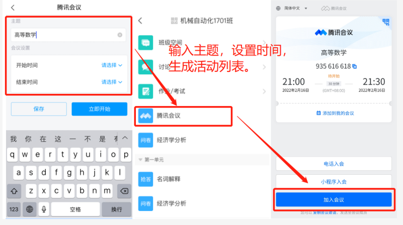 2.输入标题及时间后点击“保存”或“立即开始”,在活动列表中点击创建的腾讯会议,进入中间页,验证通过后进入指定会议室。