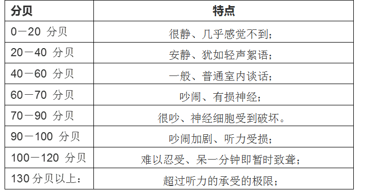 响度的单位是分贝。分贝是声压级的大小单位,声音压力每增加一倍,声压量级增加6分贝。1分贝是刚刚能分辨到的声音,130分贝是人听力的承受的极限,一分钟之内就会听力受损,出现暂时性失聪。各个等级分贝的特点如表所示: