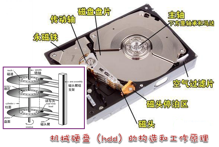 硬盘是电脑主要的存储媒介之一,由一个或者多个铝制或者玻璃制的碟片组成。碟片外覆盖有铁磁性材料。