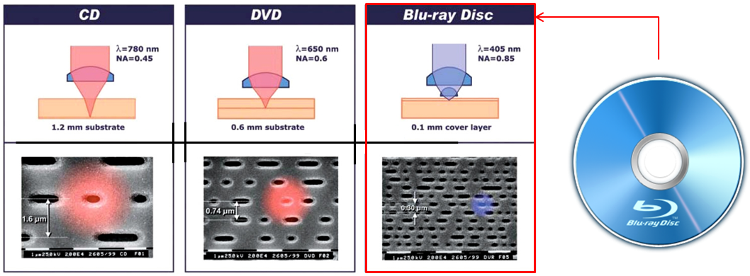 采用波长405纳米(nm)的蓝色激光光束来进行读写操作。