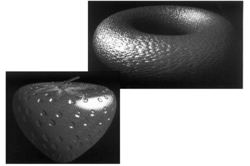 指定材料属性的另一种方法称为特征图案法(fexfure map)。特征图是一种简单的位图,它可以使用计算机绘图程序产生或扫描到计算机中。特征图能够用作物体的底或按一定的比例来应用。特征图可以采用簸箕图技术模拟一个凹凸不平的表面,这时特征图的值被用于模拟一个表面区域的升高或降低,其结果看上去像是粒状的不光滑。创作一个物体表面最高级的方法之一是利用一个称为Shader的可编程过程。许多普通材料像大理石、木头和砖等都可以利用计算机算法有效地实现,它比特征图具有更好的质感。