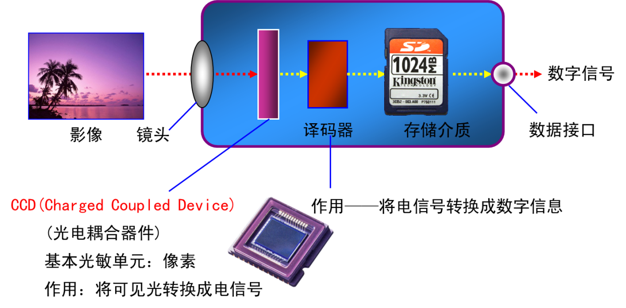 数码相机(Digital Camera)是一种采用电荷耦合元件(CCD)或互补金属氧化物(CMOS)半导体做感光器件,将所摄景物以数字方式记录在存储器中的照相机。