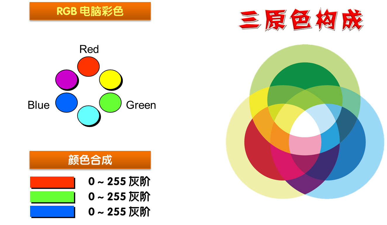 在自然界中,物体本身没有颜色,人们之所以能看到物体的颜色,是由于物体不同程度地吸收和反射了某些波长的光线所致。红绿蓝三种原色按照不同比例进行相加混合,称为三原色的混色。如红色+绿色=黄色,红色+蓝色=品红,蓝色+绿色=青色,红色+绿色+蓝色=白色。由于黄色、青色、品红色是由两种原色混合而成,这三种颜色又称为二次相加色。如红色+青色=白色,绿色+品红色=白色,蓝色+黄色=白色。因此,青色、品红色、黄色分别又是红色、绿色、蓝色的补色。