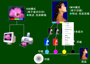 CMYK代表印刷上用的四种颜色,C代表青色(Cyan),M代表洋红色(Magenta),Y代表黄色(Yellow),K代表黑色(Black)。因为在实际应用中,青色、洋红色和黄色很难叠加形成真正的黑色,最多不过是褐色而已。因此才引入了K——黑色。黑色的作用是强化暗调,加深暗部色彩。CMYK模式是最佳的打印模式,RGB模式尽管色彩多,但不能完全打印出来。