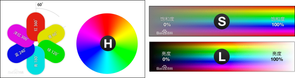 饱和度S(saturation ):是指颜色的强度或纯度。饱和度表示色相中彩色成分所占的比例,用从0%(灰色)~100%(完全饱和)的百分比来度量。在色立面上饱和度是从左向右逐渐增加的,左边线为0%,右边线为100%。