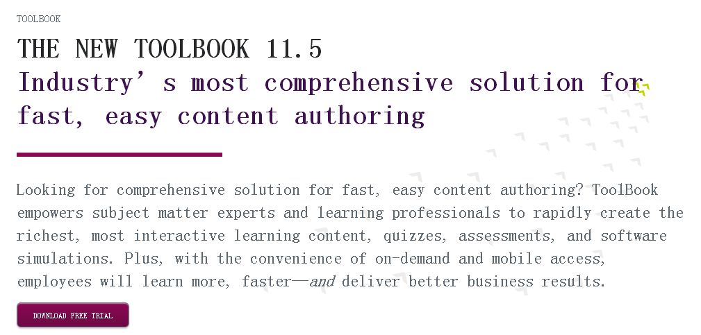 Toolbook提供了一个功能丰富的课件编辑解决方案,任何人都可以使用Toolbook开发符合国际标准的互动课件、测试、评估和模拟训练,是符合企业和培训师需求的课件制作工具,利用ToolBook的课程内容模版、页面模版和风格模版快速启动课件制作。