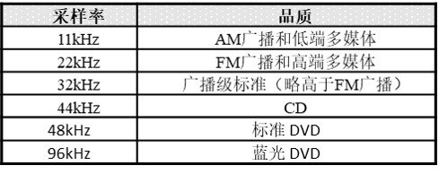 常见的采样频率主要包括11kHz、22kHz、32kHz、44kHz、48kHz、96kHz等,其中44kHz的采样频率最为常见,它代表CD唱片的音质,48kHz代表高保真的音质,各种采样频率的音质如表所示。