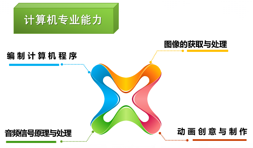 计算机专业能力主要包括素材的处理,比如文本、图片、声音、视频、动画等素材的处理技术,程序的编制能力,人机交互的实现能力与素材集成能力。