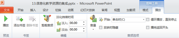 在PPT中的主要使用MP3、 WMA格式的音频,需要注意在2003版中音频与PPT是分离的,声音文件和PPT在一个文件中,在2010版以上声音文件集成到PPT中,使用时只需要拷贝PPT文件即可。同时在PPT2010以上版本中,可以实现对音频的在线剪辑,这是比较实用的功能。