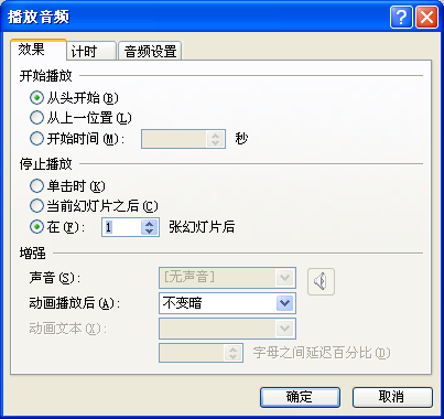 在PPT中音频默认为单机鼠标,声音即停止播放,通过设置声音的播放域可以实现声音的播放范围。如果设置为当前幻灯片之后,声音会在当前幻灯片内一直播放;如果设置为在多少张幻灯片后,声音会一直播放,实现背景音乐的效果。