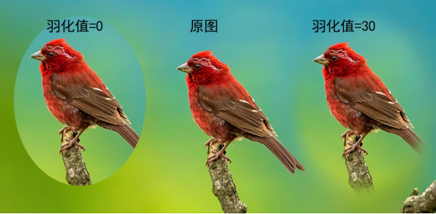 (1)羽化是在选区边缘内外建立一个过渡区域,它将选区划分为内区域、过渡区、外区域三个区域。内区域为不透明区域,外区域为透明区域,过渡区为不透明向透明的转化区。羽化值越大,过渡区域越大,虚化范围越宽,图像边缘渐变越柔和;羽化值越小,过渡区域越小,虚化范围越窄,图像边缘越清晰。