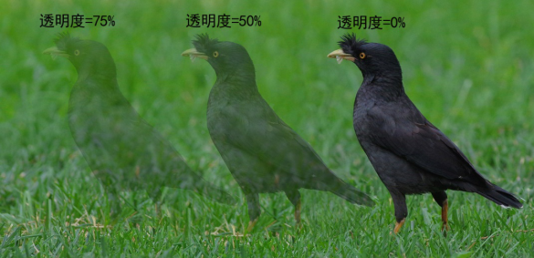 (2)不透明度是图层和橡皮擦、油漆桶、渐变、画笔、仿制图章等多个工具的重要属性。当透明度为0%时,图像完全透明;当透明度为100%时,图像完全显示;当图像透明度介于0%-100%之间时,图像呈半透明效果。