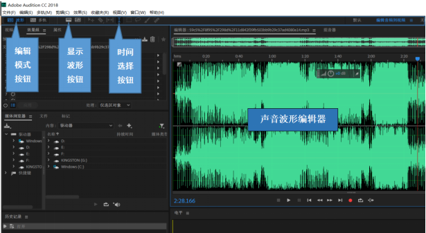 Audition CC包括单轨波形模式和多轨合成模式,单击“波形”按钮,即可进入“单轨波形”界面;在“波形”界面的常用工具栏上的“显示波形”按钮和“时间选择”按钮是默认选项,它们在编辑声音时经常使用,中间的波形是声音波形编辑区。