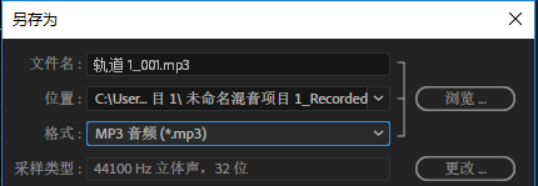 执行“文件/另存为”命令,弹出“另存为”对话框,保存类型选择“*.MP3”类型,为音频文件命名,单击“确定”。