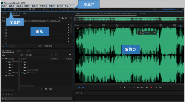 Adobe Audition是一个适用于混合音频、录制博客、广播音频节目以及恢复和修复音频录音的专业工作站。Adobe Audition CC界面包括标题栏、菜单栏、工程模式按钮栏、工具栏、主面板、多种其他功能面板、状态栏等。