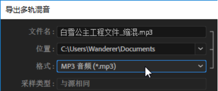 多轨合成的成品音频保存与单轨波形编辑模式不同,单击“文件→导出→多轨混音→整合会话”,在弹出的“导出多轨混音”对话框中,设置“文件名→保存位置→文件格式”等选项,通常成品音频文件格式选择为“.mp3”。
