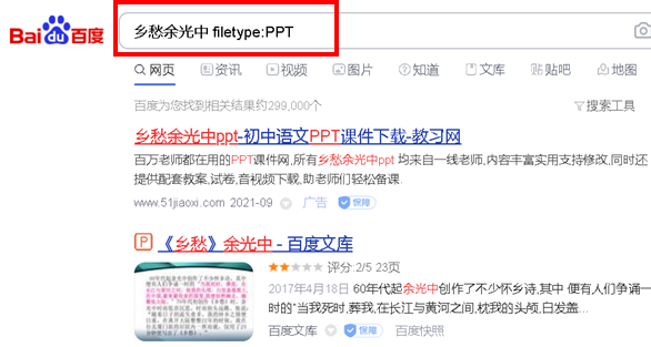例如:乡愁余光中 filetype:PPT