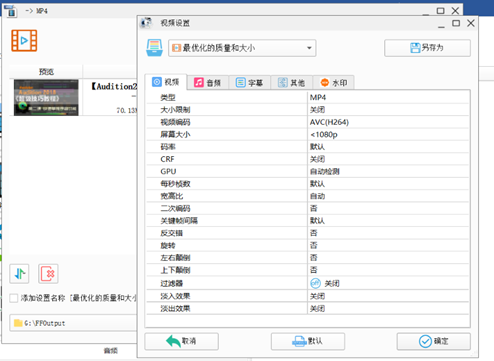 2、在输出配置中,设置视频参数。如分辨率、码率等;