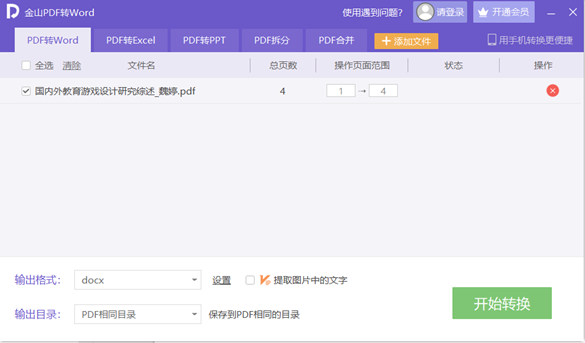 2、在弹出的“金山PDF转Word窗口”中,选择输出格式以及输出目录,并更改操作页面范围后,点击“开始转换”;