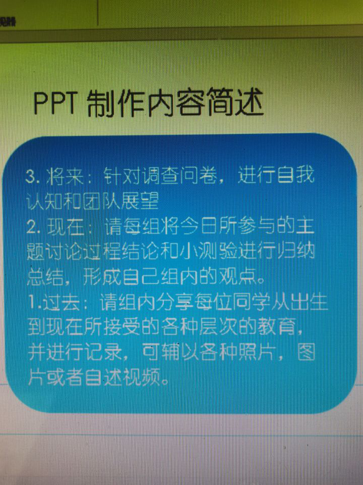 过去:各位成员可以将每位同学从出生到现在所接受的各种层次的教育历程进行回忆和记录,可以辅以图片,照片或者自我介绍视频,记得给父母打个电话,要点你小时候的可爱照片。