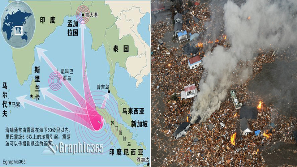 左图:2004年1月发生在东南亚海啸属于地震海啸,造成巨大财产损失和人员伤亡,其中遇难者人数接近30万人。