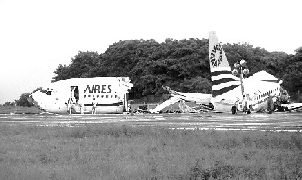 2012年3月6日,哥伦比亚客机遭雷击裂成三截,1人死亡。圣安德烈斯岛上的机场跑道已经关闭,救援人员正在那里清理现场,飞机碎片散落一地。