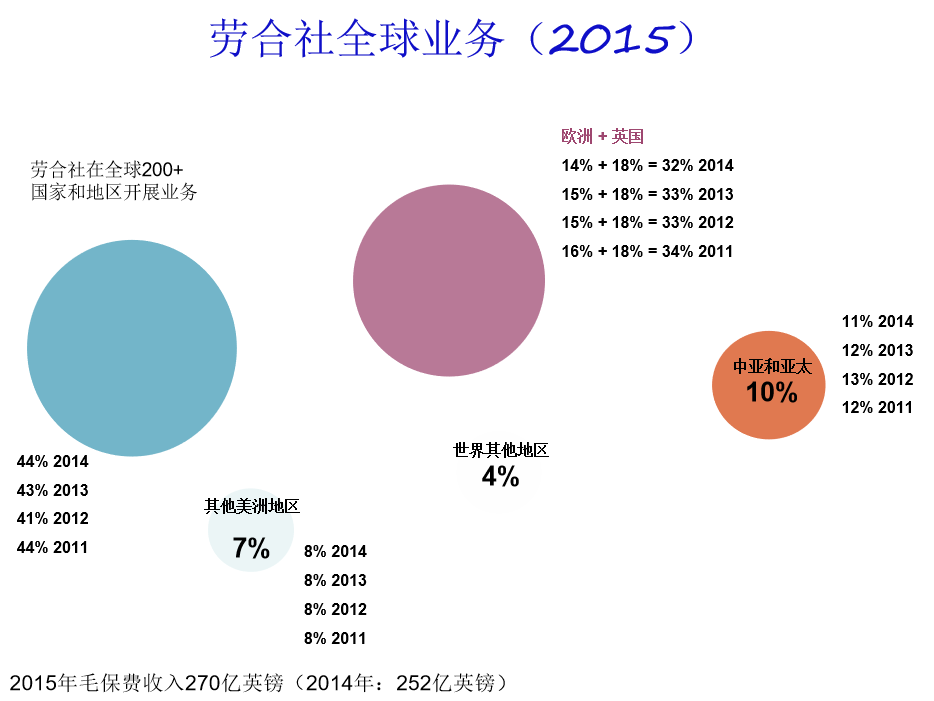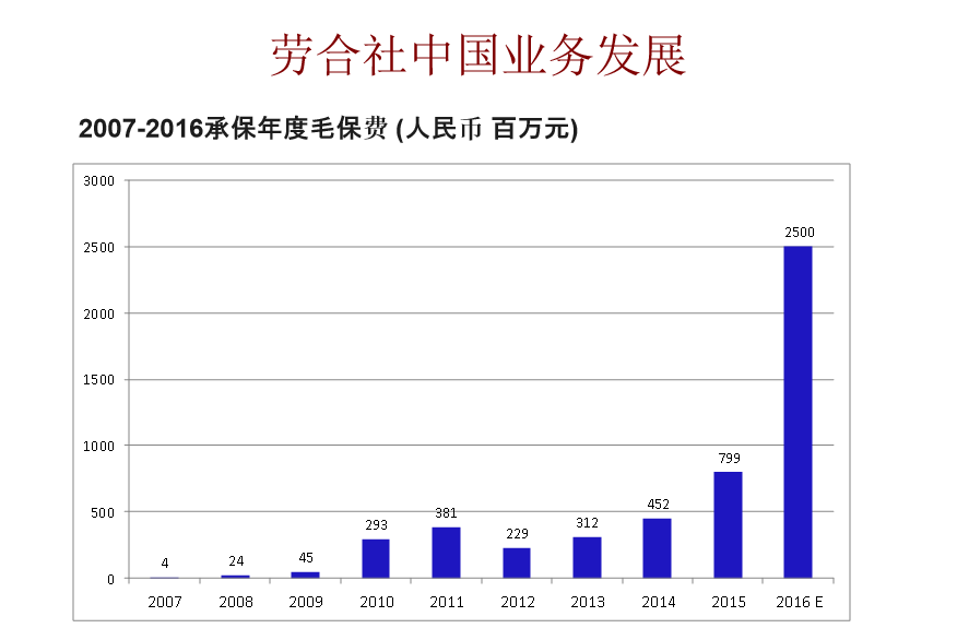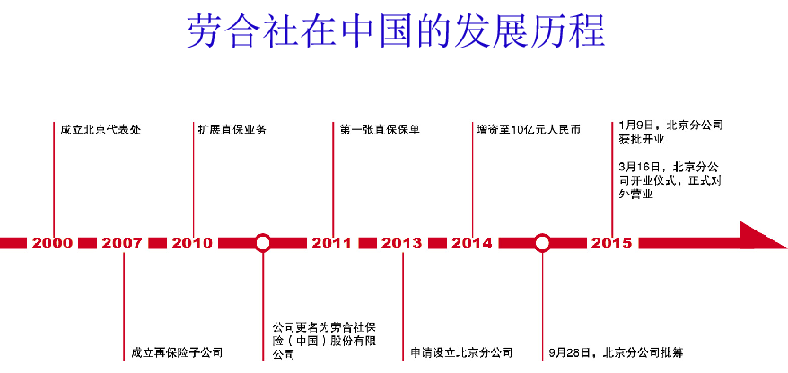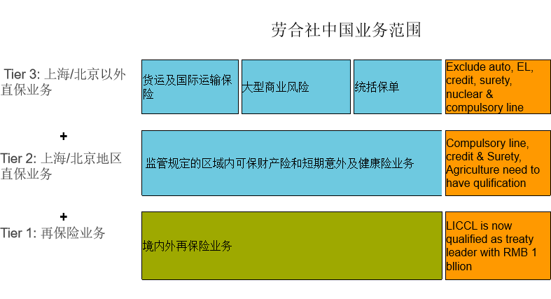 2007年4月,劳合社在上海开业。劳合社(中国)有限公司注册资本2亿元人民币,业务范围包括中国境内的再保险业务、中国境内的转分保业务、国际再保险业务。