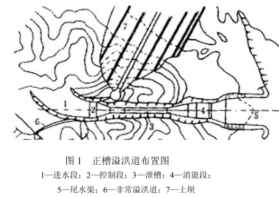 典型的正槽溢洪道,从上游到下游依次由引水渠段、控制堰段、泄槽段、消能段、尾水渠段等部分组成,如图 1 所示。
