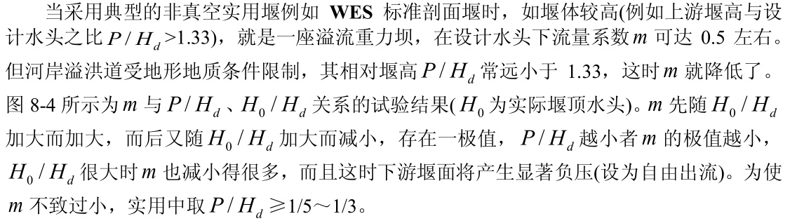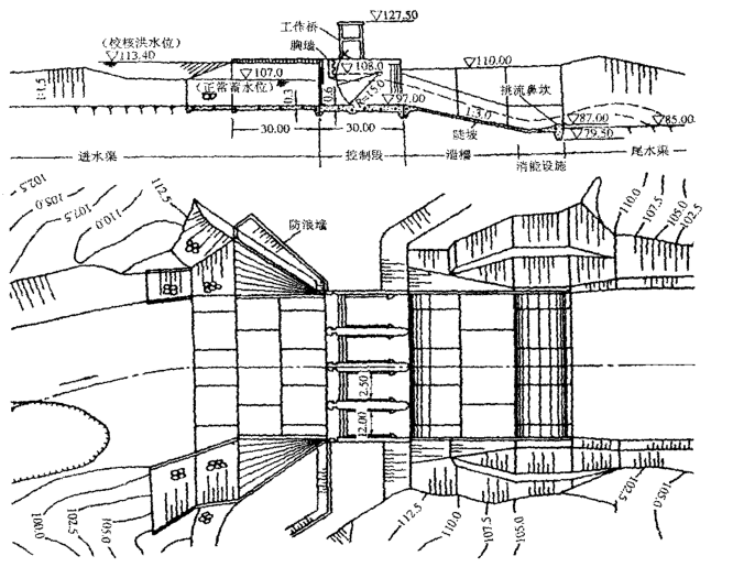 当采用宽顶堰时,溢洪道的控制堰段与一座水闸的闸室无异。而且,当为岩基时,这种闸的抗渗、稳定等要求更易满足,底板也可薄得多。