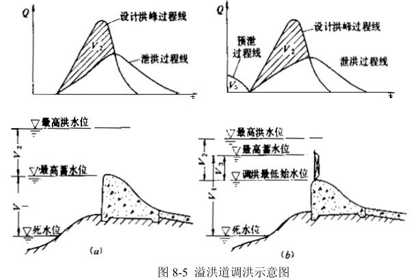 溢洪道的溢流堰可以有不设闸门或设闸门两种布置方式,二者在调洪性能方面差别很大。不设闸门情况下,如图 8-5(a)所示,水库用于非汛期兴利(灌溉、发电等)的最高蓄水位(正常高水位)只能与堰顶平;洪水期来水超过水库兴利输水建筑物向下游的最大输水能力后,即由溢洪道自由弃水。这种布置方式的调洪特点是兴利库容V1全在溢流堰顶之下,而防洪库容V 2 全在堰顶之上,后者是由来水超过泄水能力而强迫抬高的,也称强迫库容。堰顶设闸门情况下,如图 8-5(b)所示,由于闸门关闭可以挡水,开启可以泄水,因而有多种可能的水库调洪运用方式。例如以一极端方式而言,可以把非汛期最高蓄水位定在闸门顶附近,非汛期末或当有水文预报条件的洪峰到来前若干时段,开闸放库水位至与堰顶平,然后在洪峰来临时,堰顶以上即可全作防洪库容V2之用。由此可知设有闸门情况下兴利库容V1与防洪岸容V2有重叠部分,闸门高度范围内的库容是可能的最大重叠库容V3。