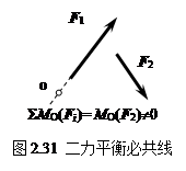 如图2.31所示,若有不共线的二力F1、F2作用在物体上,则取其中任一力作用线上的任一点o(二力交点除外)为矩心,必有∑MO(Fi)¹0,故二力平衡必共线。