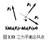 如图2.32所示,有三个力F1、F2、F3作用在物体上,若其中有二力交于某点o,而第三力不过o点,则必有∑MO(Fi)¹0。故三力平衡时,若有二力相交,则第三力必过此交点。